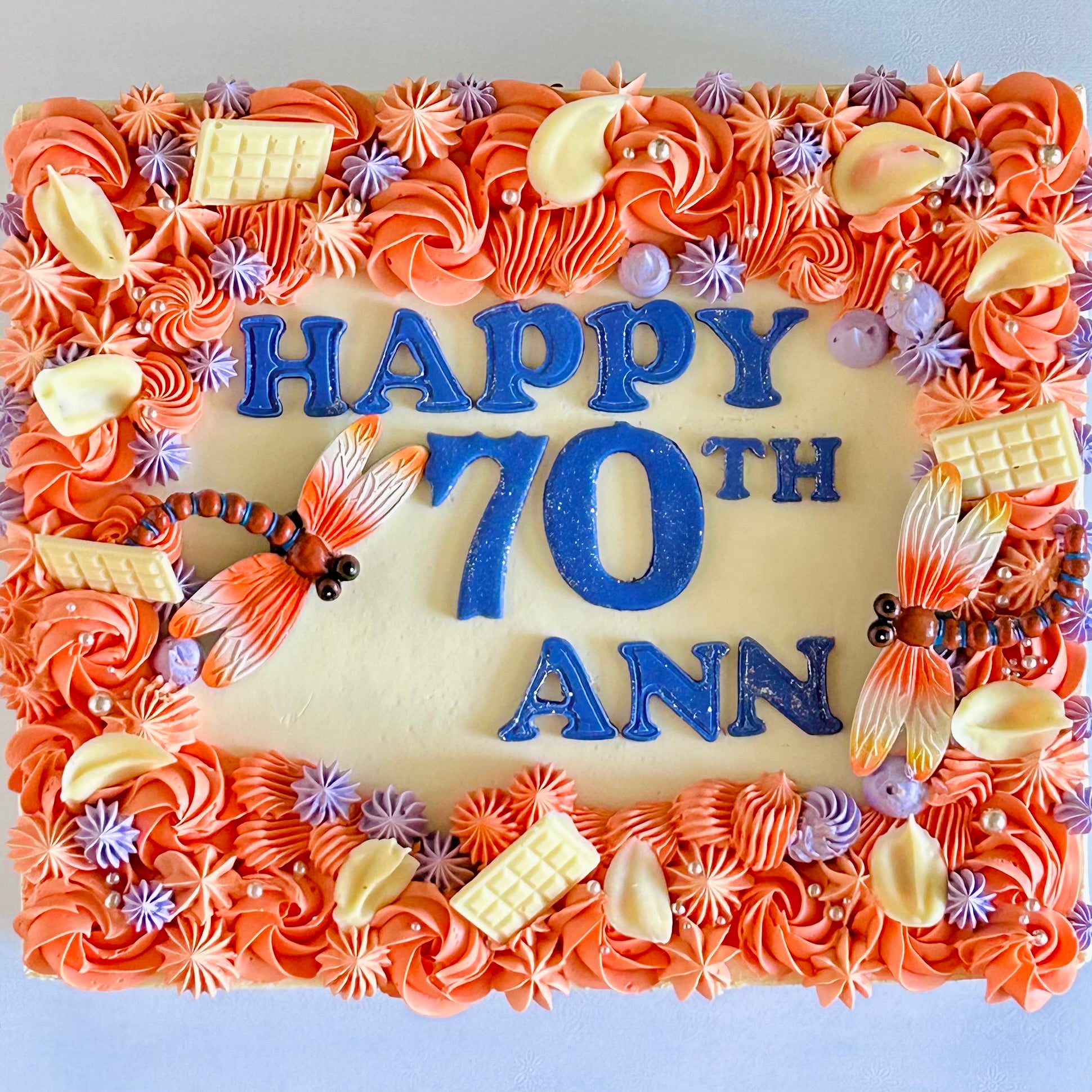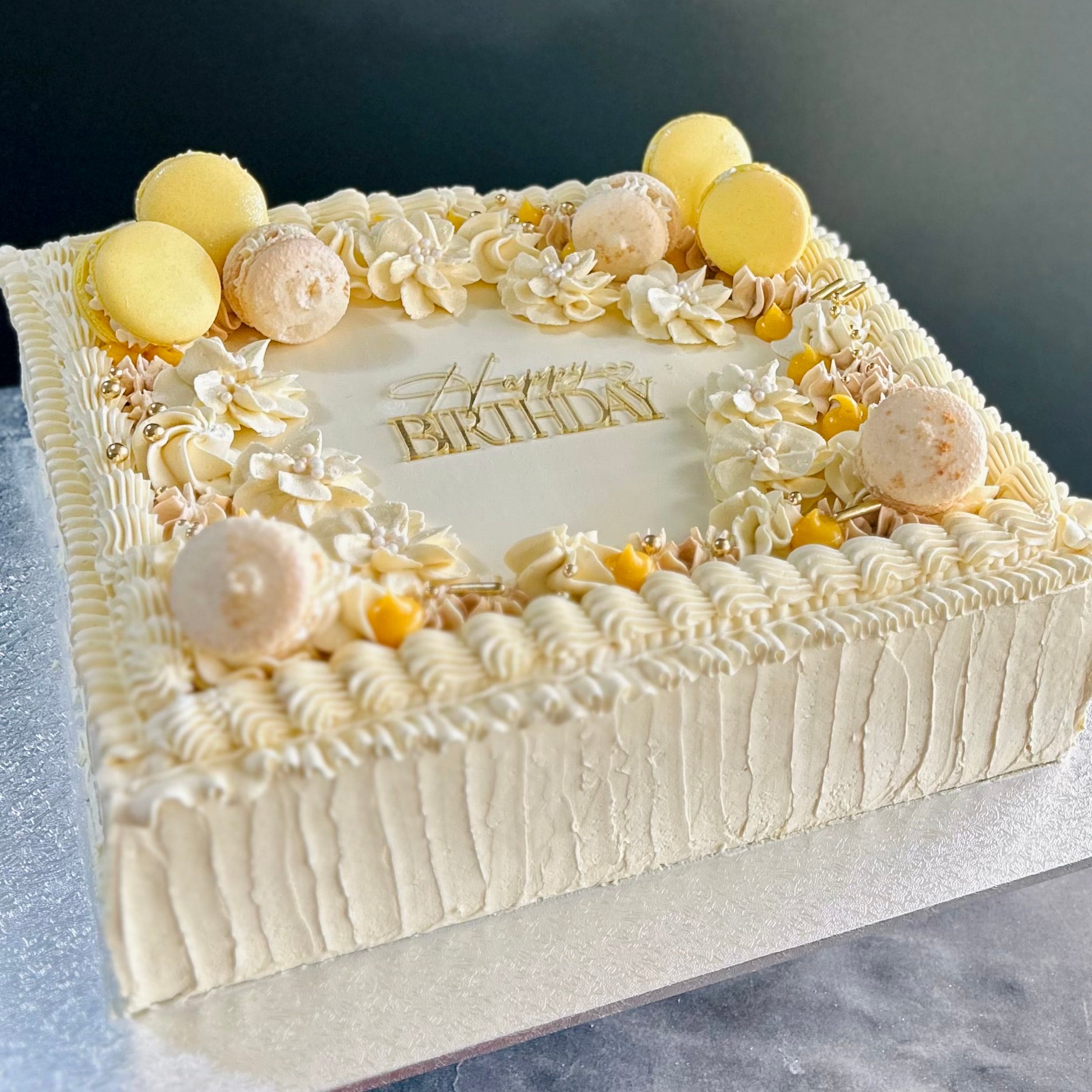 Three layers of sponge cake layered silky smooth vanilla Italian meringue buttercream (IMBC). Decorated with IMBC swirls and rosettes, chocolate decorations and garnishes.